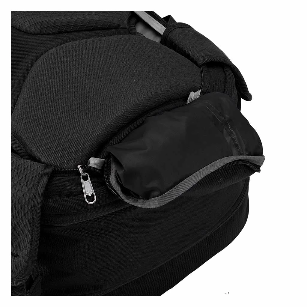 - Bottom pocket contains a raincover that doubles as a protective shield for the back panel, keeping straps neatly tucked away if you need to check your bag