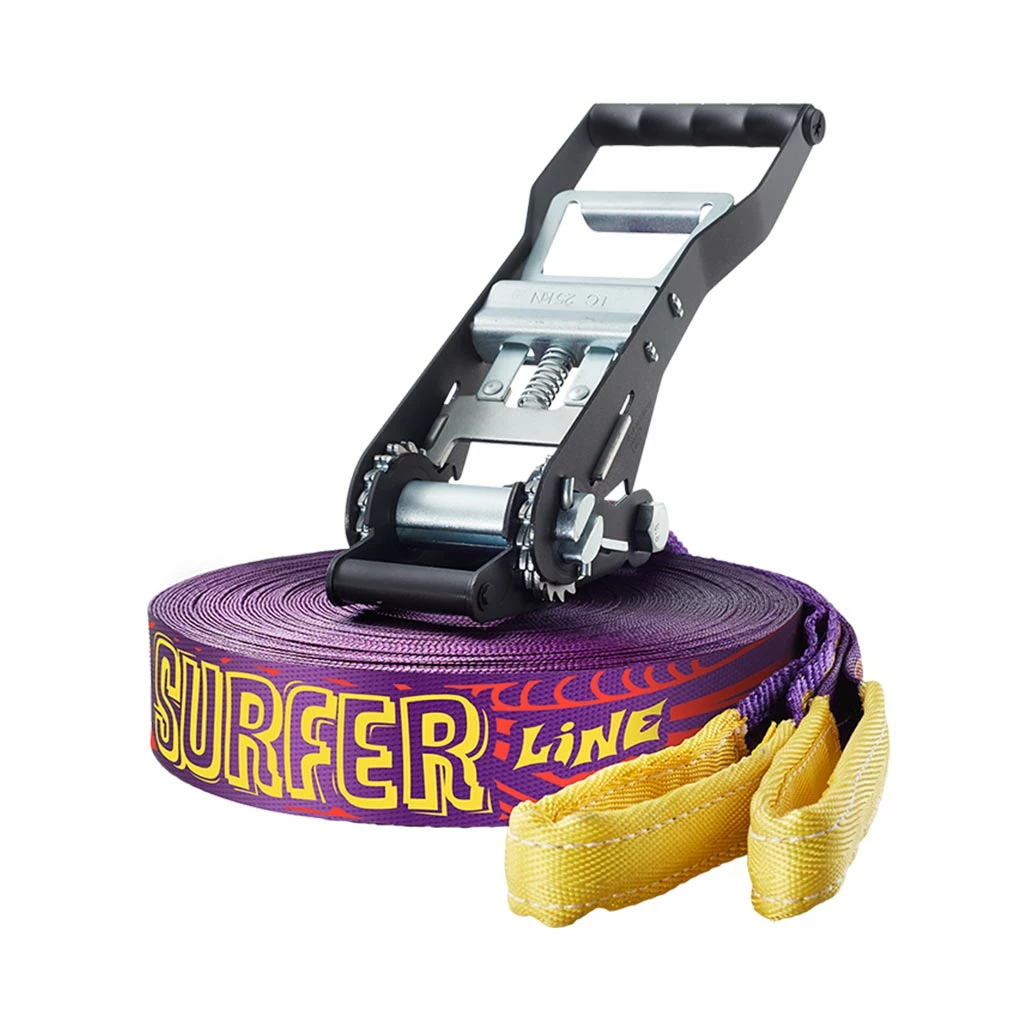 - Contents: 27.5 m slackline with protected loop, 2.5 m ratchet band with unprotected loop, Power Ratchet with safety lock, tree protection