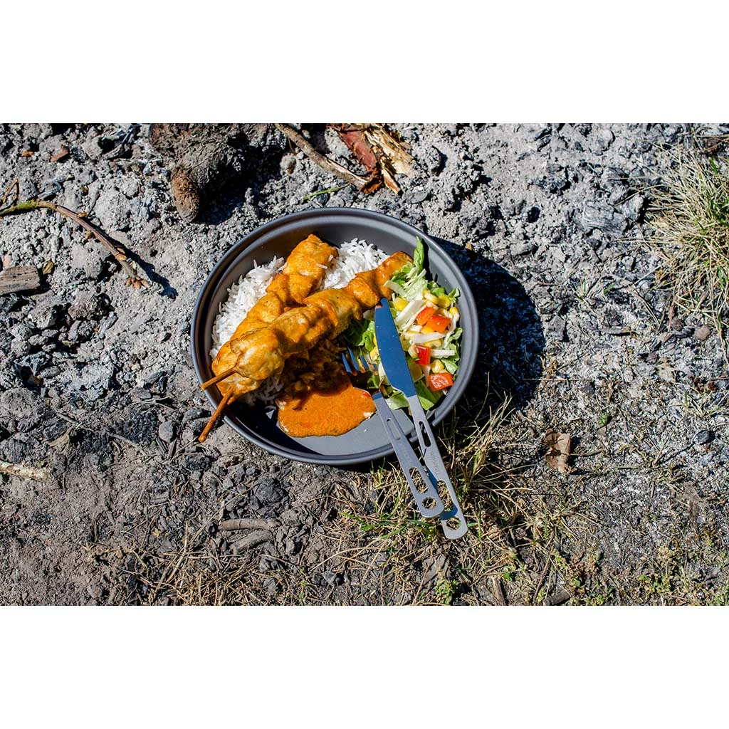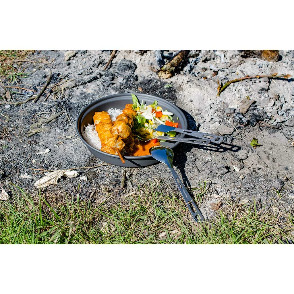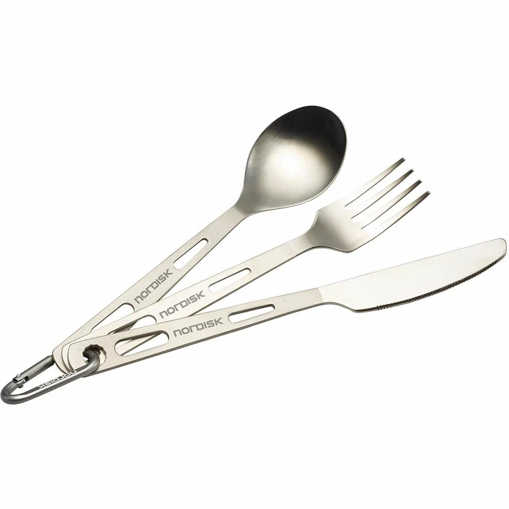 The titanium utensil set consists of a full-sized fork and spoon. Both are made of titanium, taking up very little space, and weighing close to nothing. The carved out holes in the handles reduces weight and the choice of titanium adds strength and sturdiness to the construction, both the fork and spoon are equipped with polished eating surfaces and milled handles for a better grip. Both pieces are equipped with an angular hole for the enclosed carabiner, and the printed Nordisk nametag