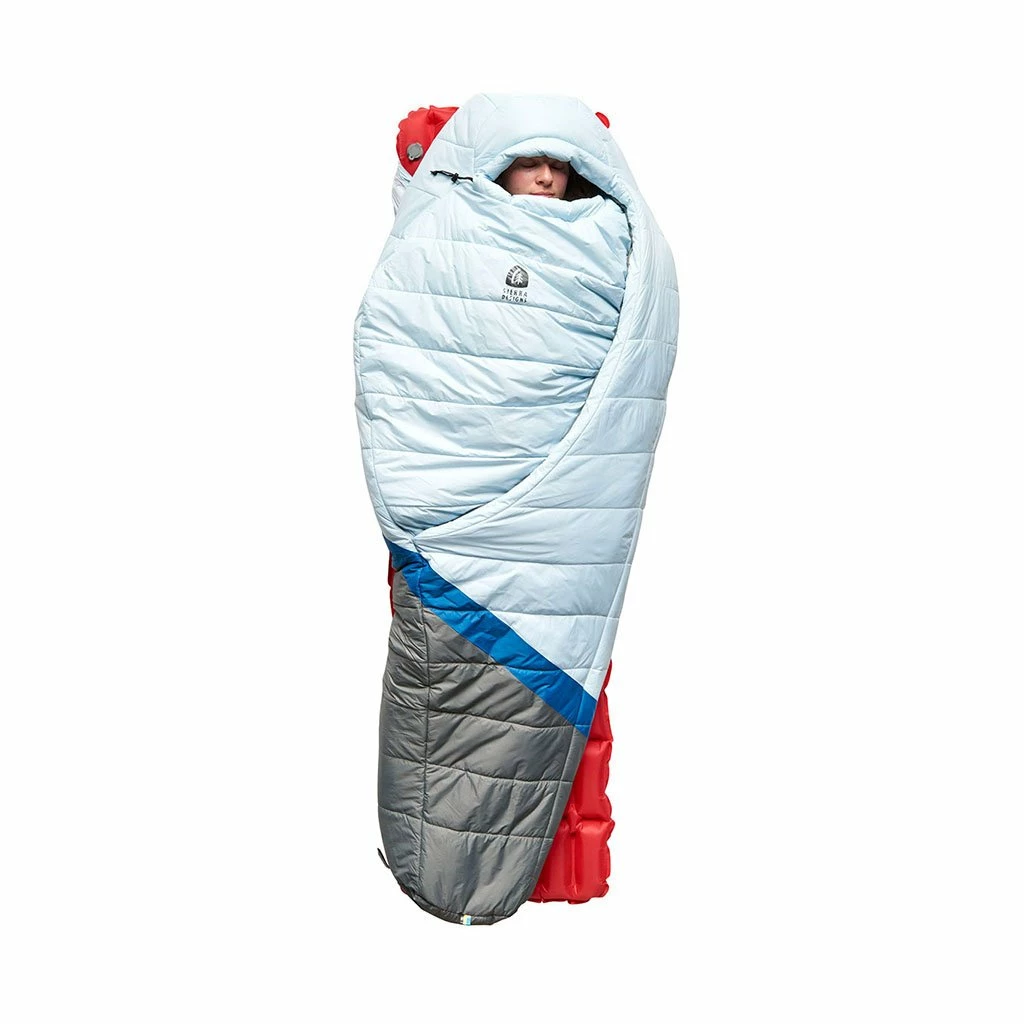 A synthetic version of Sierra Designs’ bestselling Cloud series down bags, the Night Cap employs the same innovative zipperless construction to give you the feeling of nestling down for a night in your bed, rather than squeezing into a sleeping bag. An oversized insulated blanket flap gives you all the comforts of home and a shaped shoulder pocket ensures it stays in place all night long, stopping any draughts. But if you find yourself getting too warm, then there’s a self-sealing foot vent to cool your toes, or just stick an arm out of the top while keeping the rest of your body toasty. An integrated sleeve for your sleeping mat also stops it from slipping around underneath you. Filled with premium fully recycled synthetic insulation, the women’s Night Cap 20F is designed to keep you warm even when temperatures dip down to -6°C