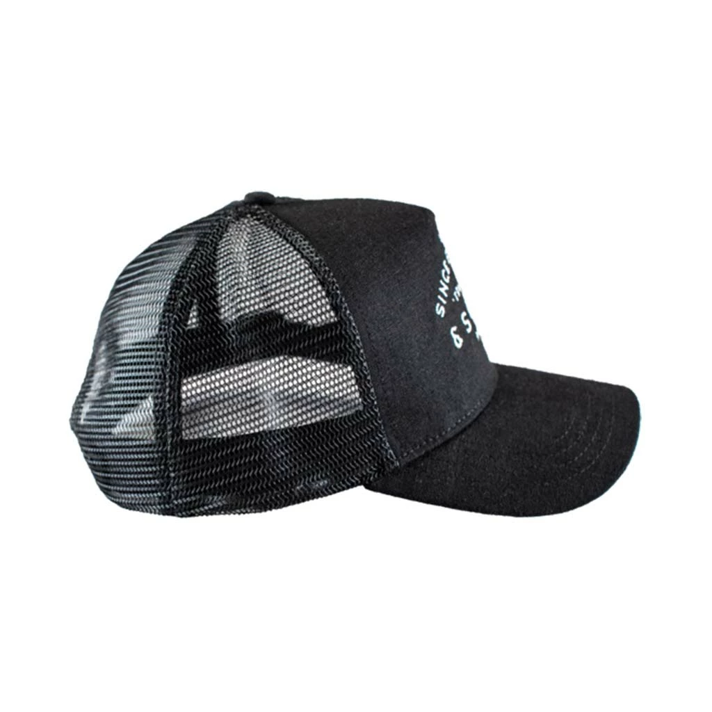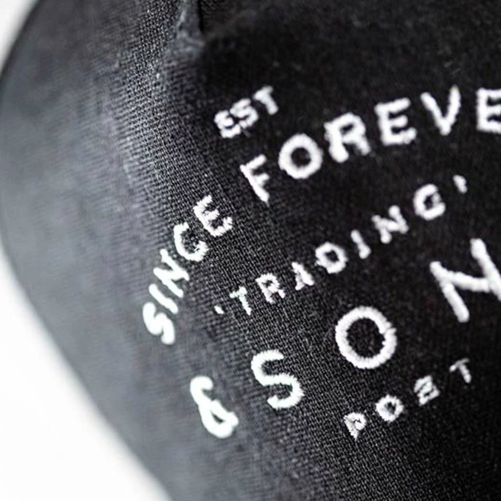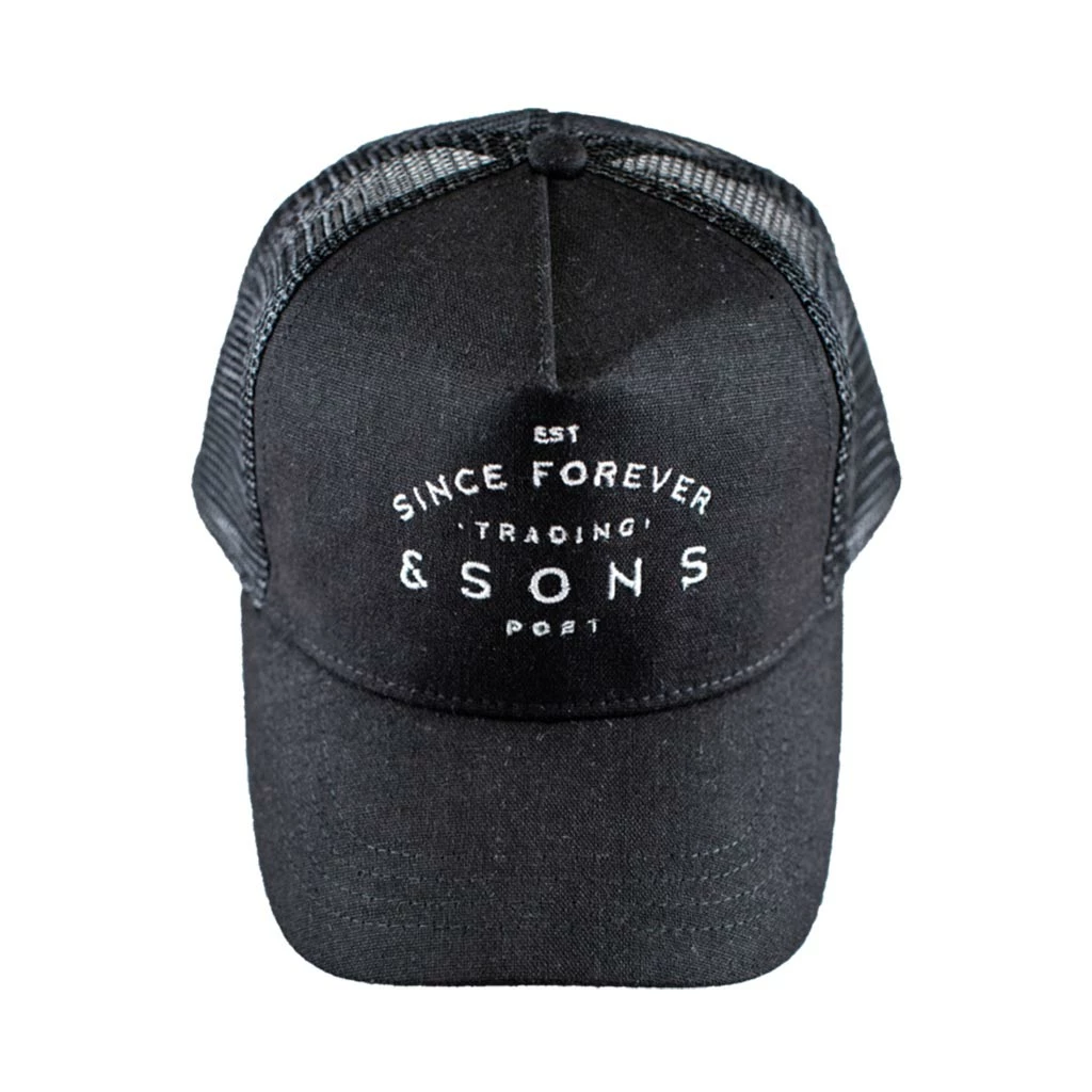 &SONS first version of the classic 5 panel ‘Trucker’ cap is made with a jet black cotton linen on the main front panel and peak, matched with a poly mesh rear to keep you cool in the Summer months. One size fits all with a snap adjuster on the back and a padded sweatband inside for comfort.